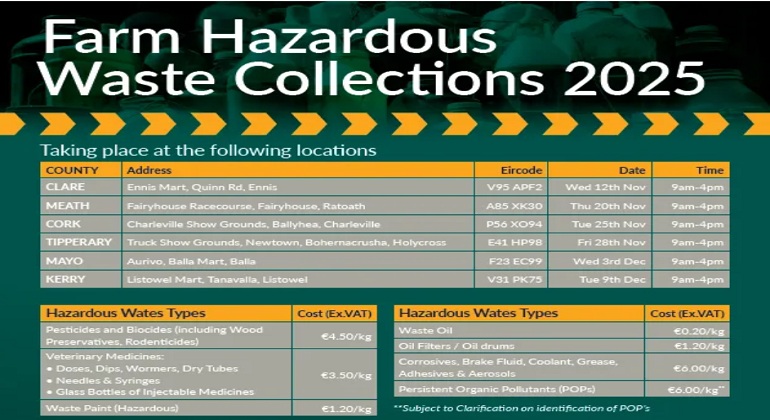 These events follow the successful trial of farm hazardous waste collection days held in Wexford, Laois and Offaly in autumn 2024.